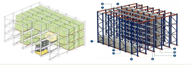 Through shelves in the same space than the usual pallet racking almost twice the amount of storage capacity, because of the abolition of the roadway located between the rows of shelves, the shelves are combined to make the same layer, the same column of the goods through each other.
